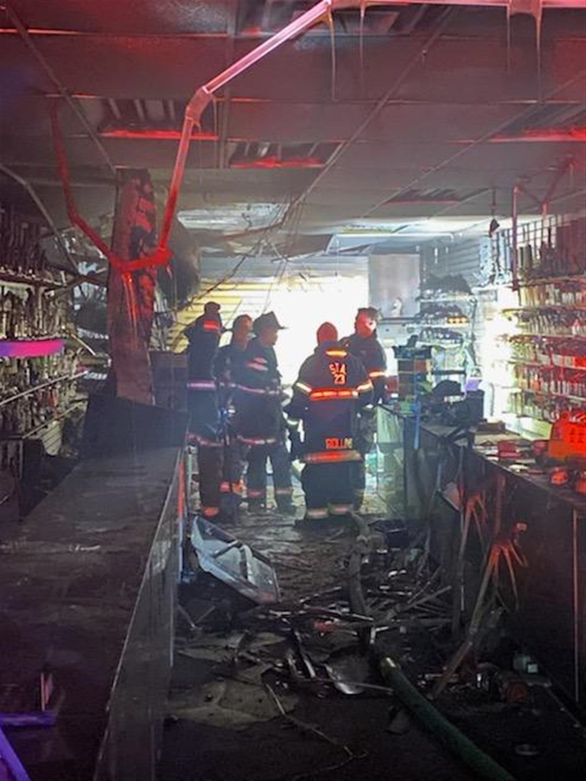 Four firefighters in full gear stand amidst a dimly lit, heavily damaged store with debris scattered on the floor. The ceiling appears partially collapsed, and shelves are disordered. Hoses and broken items are visible, giving a sense of recent firefighting efforts.