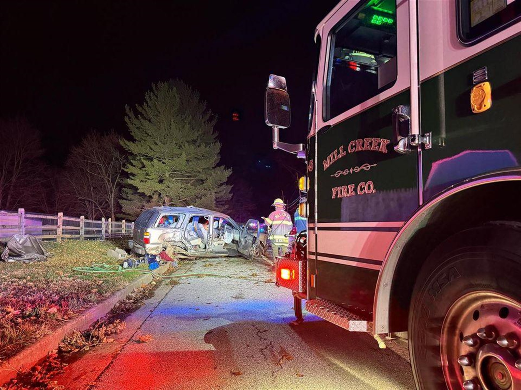 February 28, 2024 – Just before 10:30 PM, Mill Creek Fire Company as well as New Castle County Paramedics were dispatched for a reported motor vehicle crash (MVC) with a roll over and ejection. There were also reported wires across the roadway. The single vehicle crash was located in the 400 block of McKennans Church Road just south of Newport Gap Pike (Rt 41).