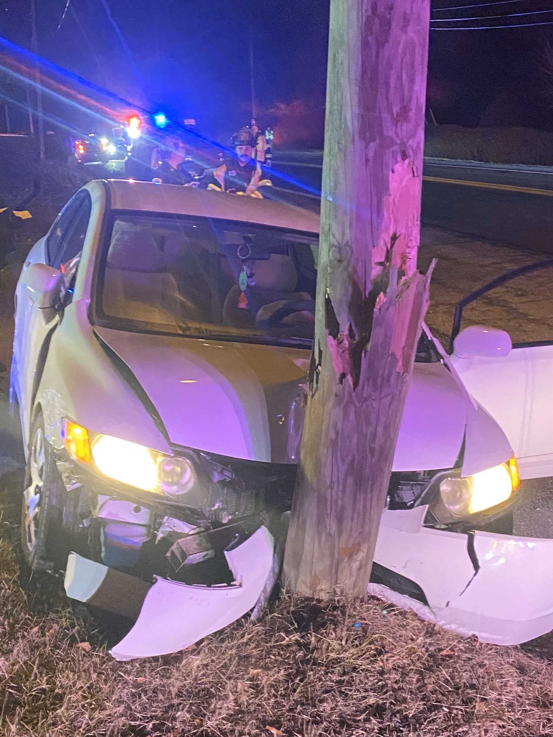 A car is crashed into a wooden utility pole at night. The front of the vehicle is damaged, and police lights are flashing in the background. The car's front bumper is visibly crumpled with debris on the ground.