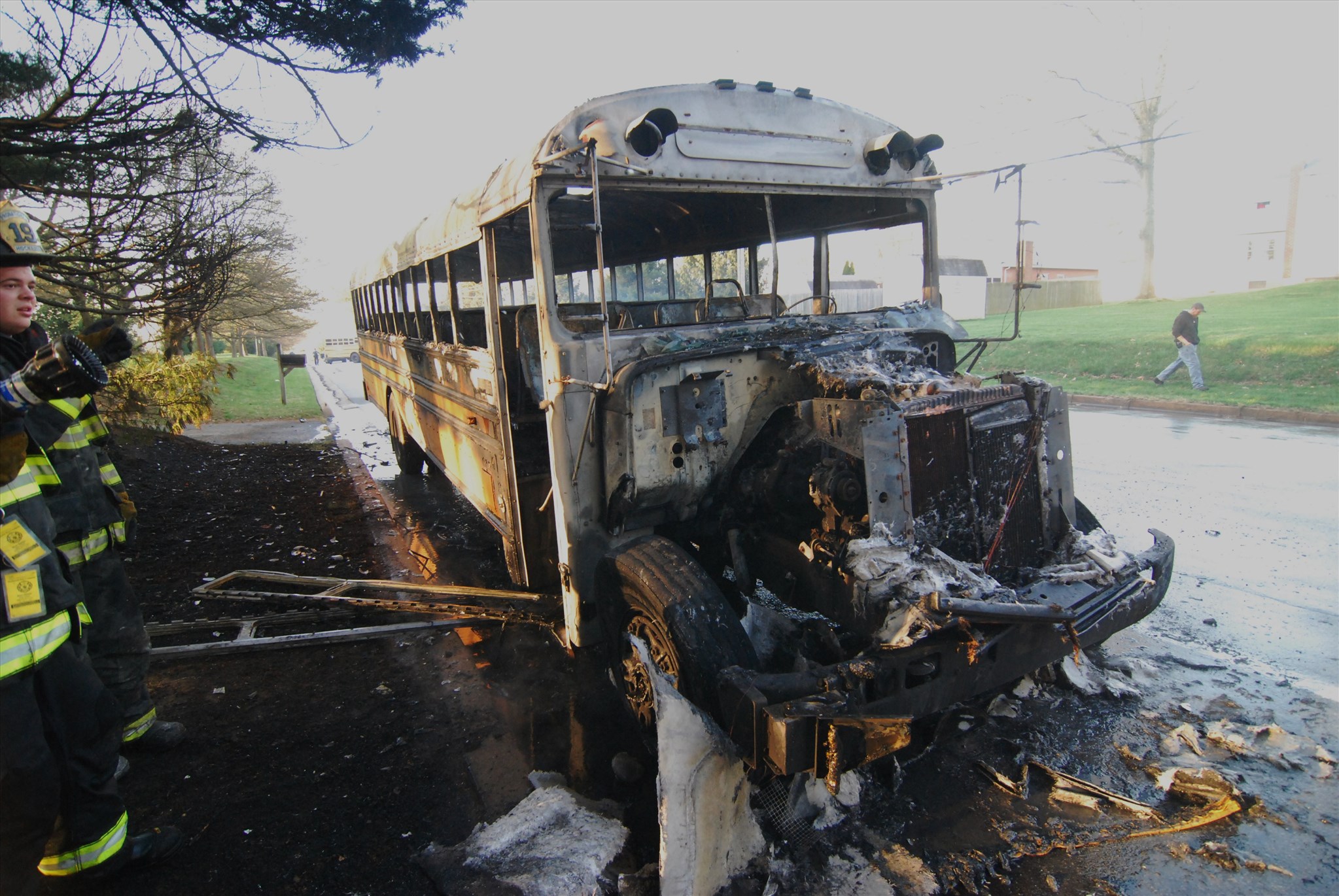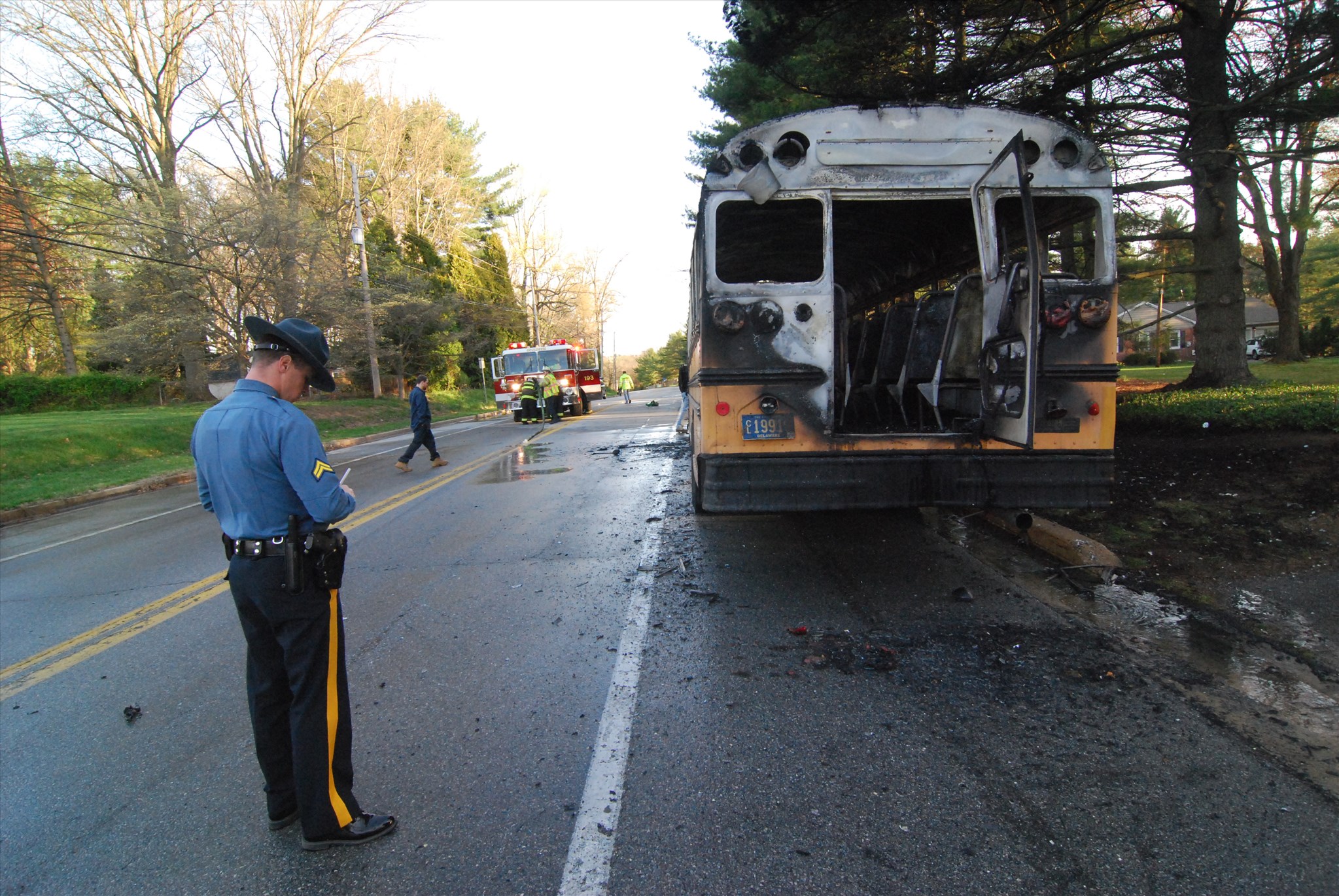 Mill Creek Fire Company and Hockessin Fire Company were dispatched to the alarm at approximately 7:15 AM. When Hockessin firefighters arrived they found the school bus fully involved. Fire apparatus from Mill Creek Fire Company responding to the alarm found their path blocked by another school bus east on McKennans Church Road and had to detour around the scene to get to the fire. The school bus was making a U-turn on McKennans Church Road to avoid the bus fire when it broke down just east of the fire blocking both travel lanes.