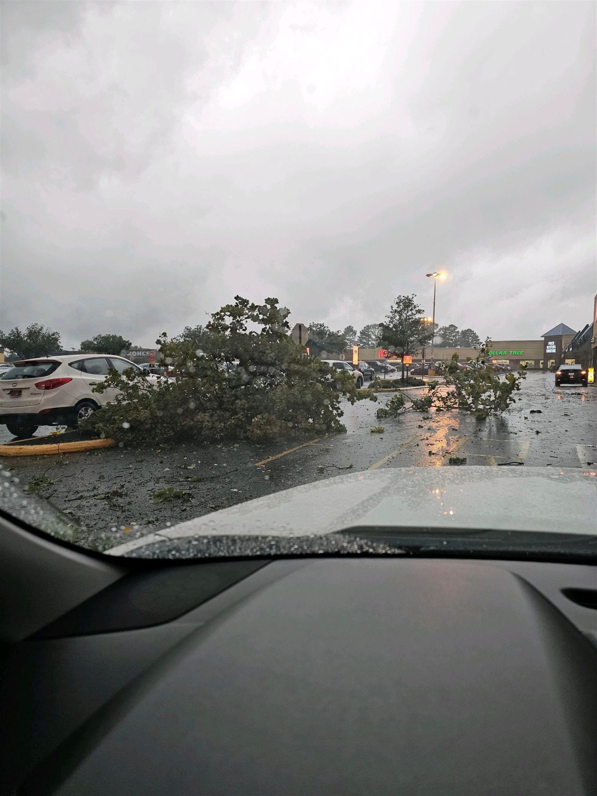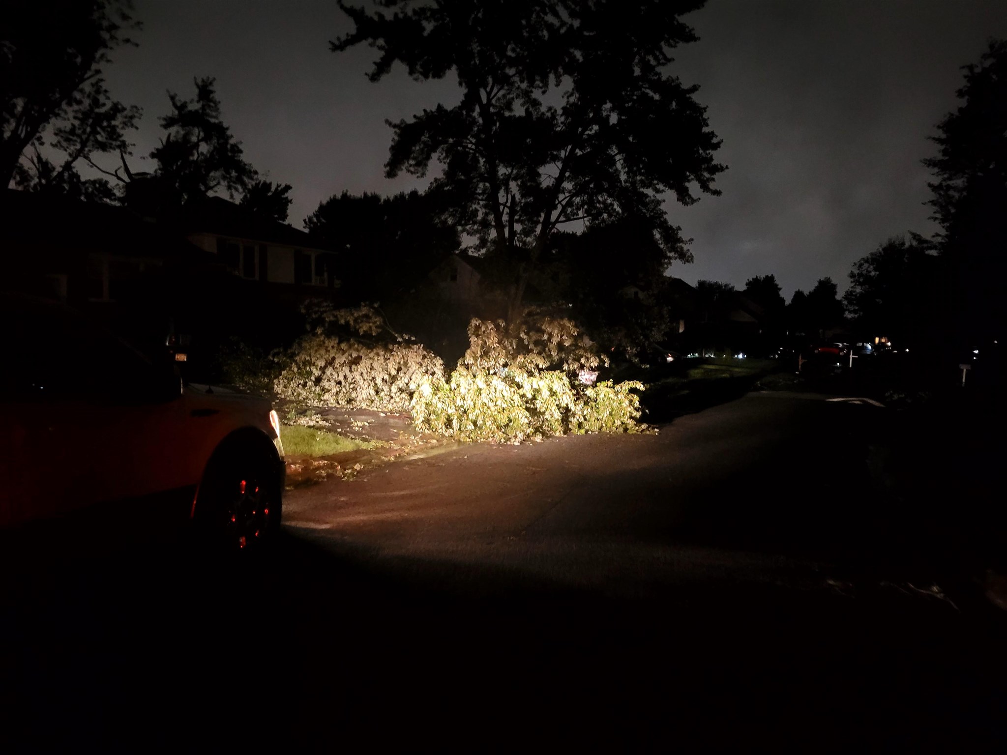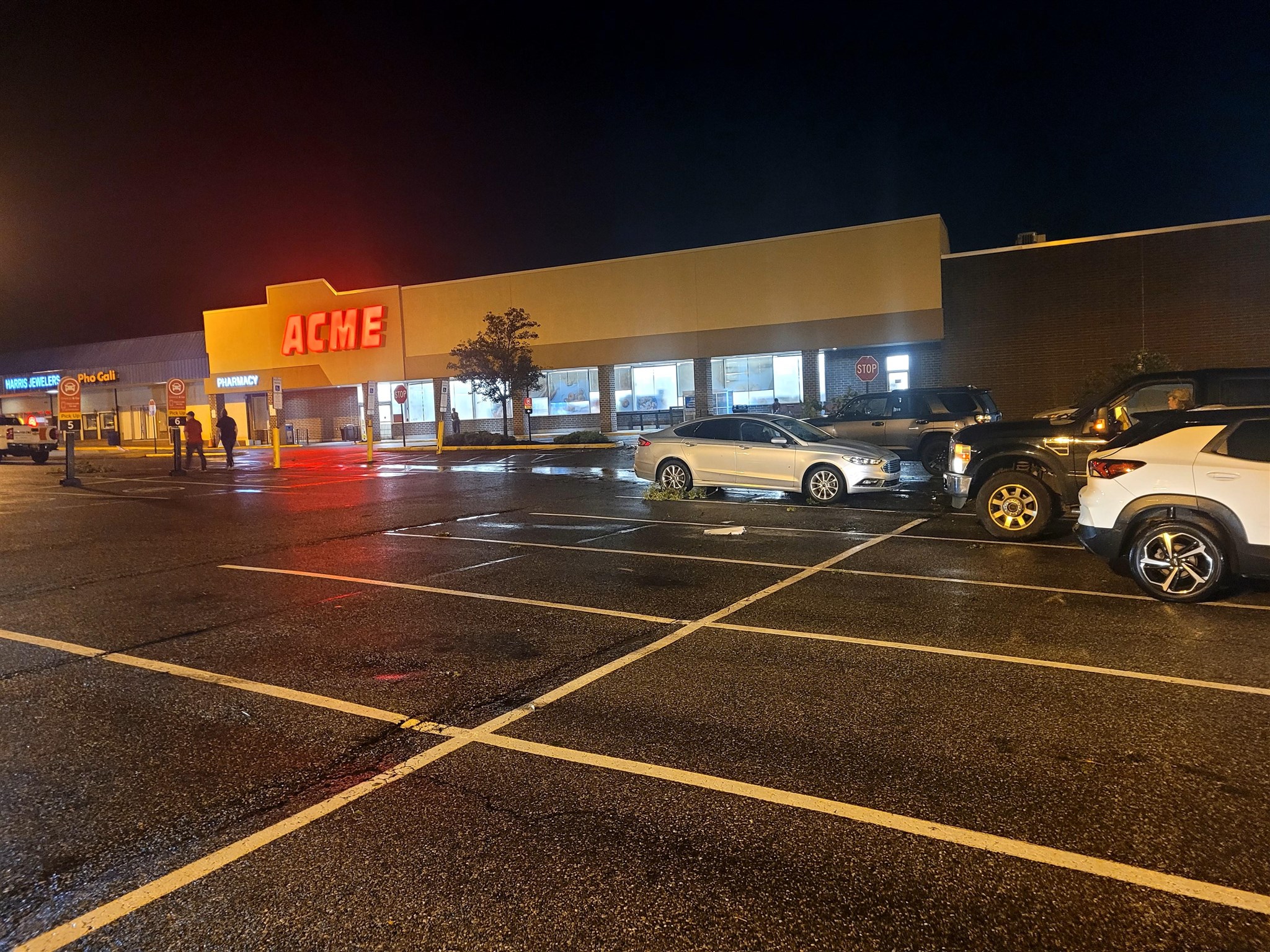 The Acme store in the Kirkwood Plaza shopping center had part of their roof damage, trees have fallen on homes and cars from Kirkwood Gardens to Sherwood Park. The storm passed through Duncan Road and Crossgates off of Mill Creek Road. No injuries were reported.