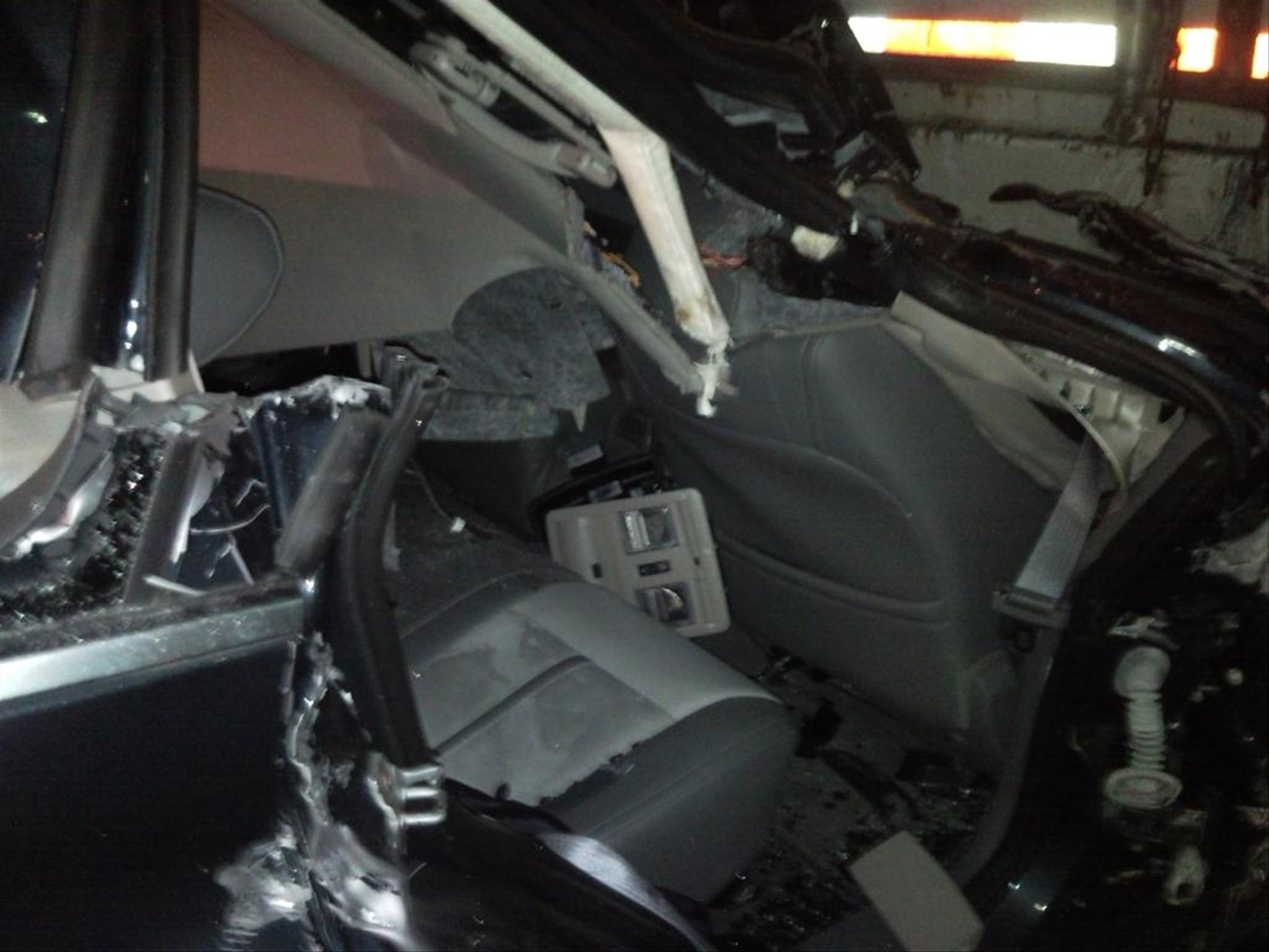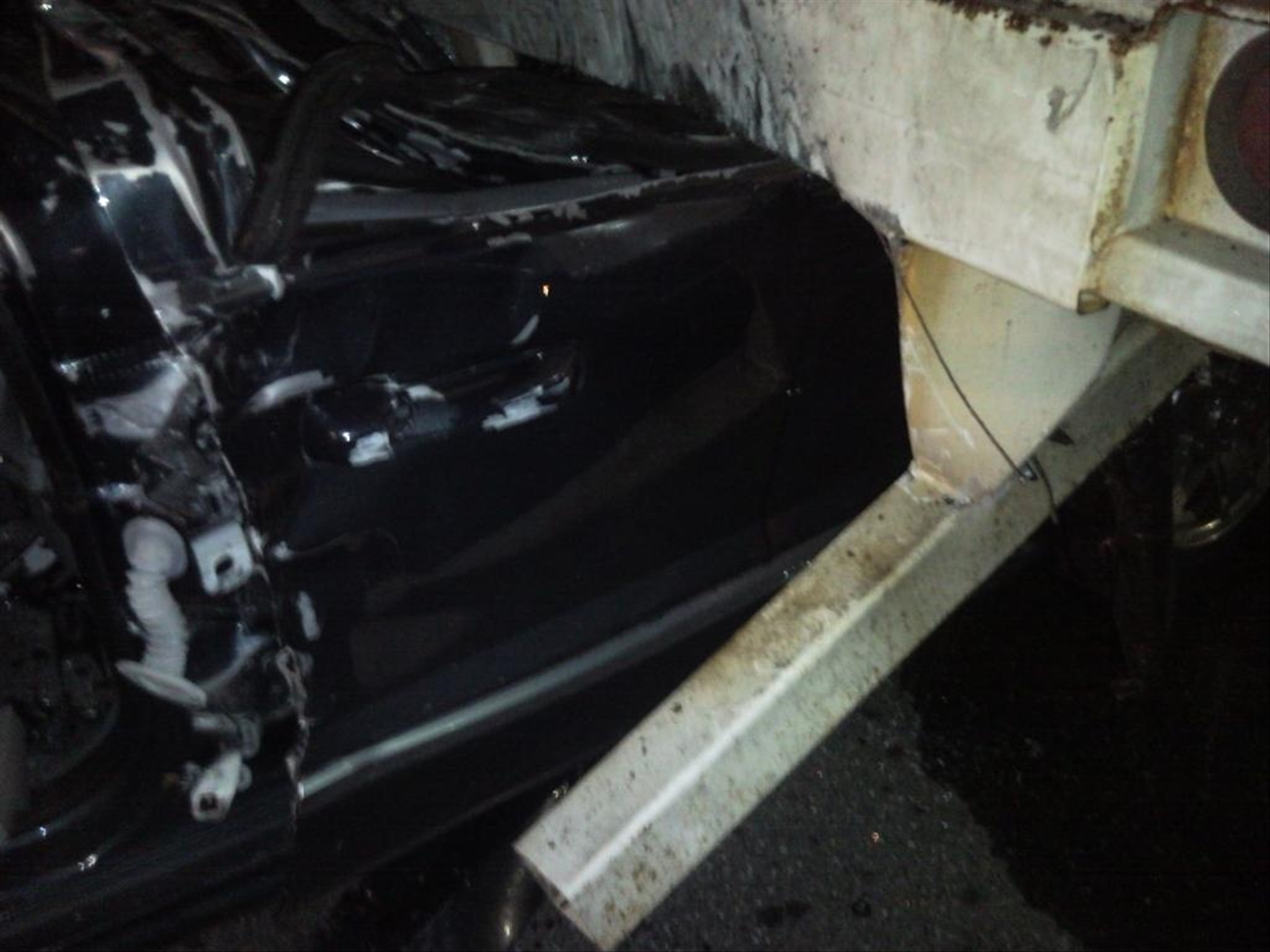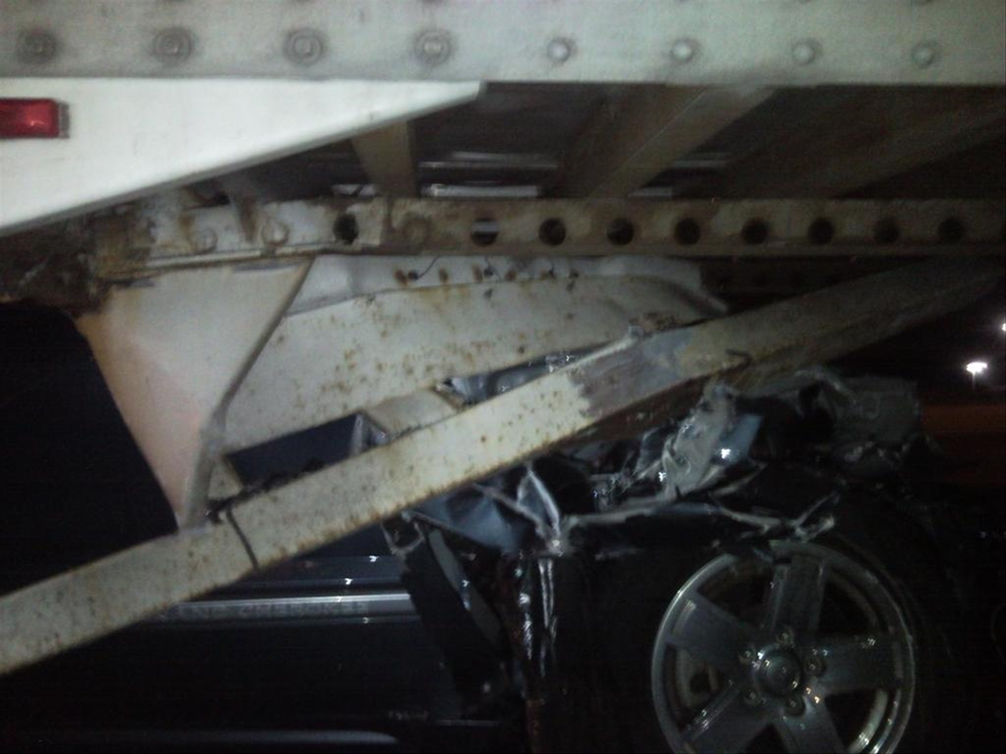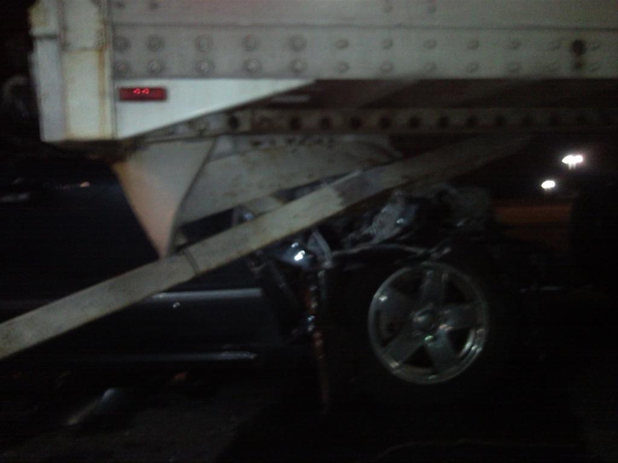 A car is partially lodged under a large truck trailer. The car's front is heavily damaged and crumpled. The image is dimly lit, highlighting the extent of the collision with reflective sections on the trailer.
